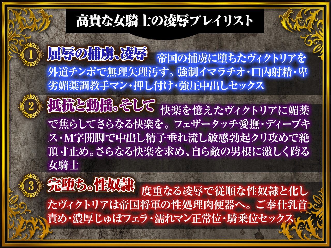 ジャンル: ファンタジー、拘束、辱め、処女、中出し、監禁、縛り・緊縛、戦士、男性向け、成人向け、わからせ、悪堕ち